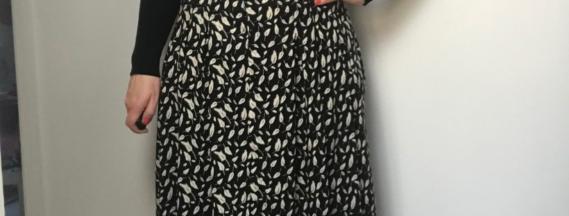 In my wardrobe I have a white and black patterned button through midi skirt. It was a summer staple last year so when the mini heatwave hit last week I thought it was a chance to get it out again. No such luck. I’ve put on a fair amount of weight since last summer and although I’m working on getting rid of it I’ve a way to go yet. Luckily Sew Over It had recently released their new skirt Emmeline. A button through midi! In my fabric stash I had the perfect black and white leaf patterned viscose which I’d purchased from them when I did my last sewing class (20% off fabrics on the day of your class).
