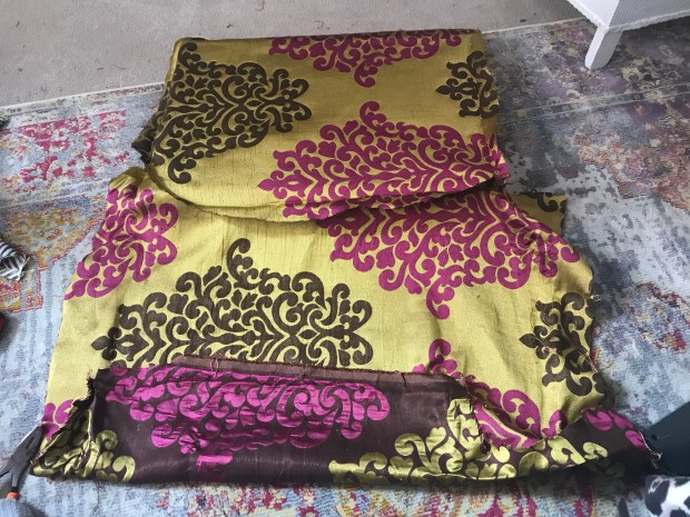 Step 2: Find two pieces of hardwearing fabric. One that is about 5cm bigger than the tray base and another about 15cm bigger. I had just re-upholstered a chair so I recycled the fabric that came off that.