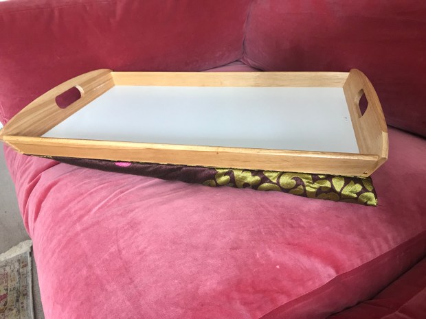 Step 1: Find a wooden tray with raised edges. I found this white and rubberwood one in Ikea for £4.50. It’s quite large (38 x 58cm) but that gives you room for a glass of water (or wine) and condiments.