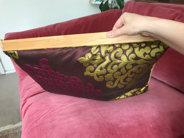 It seems ridiculous but we don’t have room for a dining table at home even though we live in a three-bed flat. So we eat on our knees, endangering our expensive brand-new velvet sofa every evening. For ages I’ve been looking for a beanbag lap tray but all the ones I’ve found have been hideous, and not even in a kitsch way. When I saw this tray in Ikea I thought perhaps I could make one and I’m pretty pleased with the result.