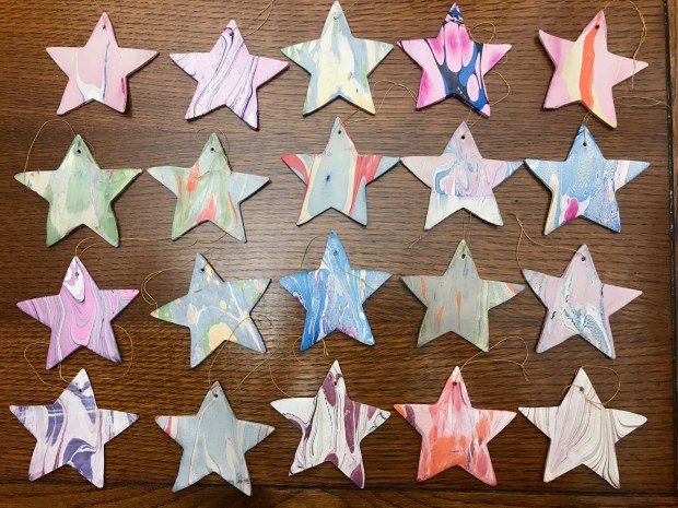 I’d seen some beautiful marbled baubles and wondered if I could make them myself. I found these plain ceramic baubles for sale on Little Crafty Bugs and decided to give them a go. At the same time, I thought I might try making my own clay stars using air dry clay. I used two different types of clay and found that DAS white was the best. It cut out cleaner and was more durable once dry.