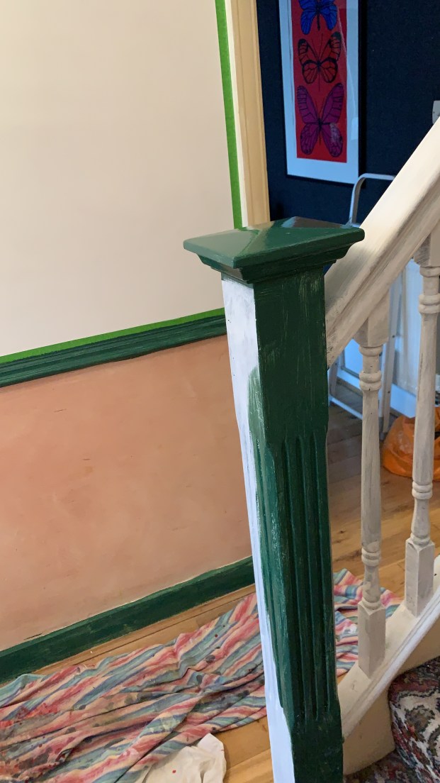 Having never been a fan of green I’d recently suddenly changed my mind and painted a wall sage in our old bedroom. Now I wanted to try a darker hue which I decided to use on the bottom half of the wall, under the dado rail, as well as on the bannister and wood work. My FIL surprised us by completing the white top half while we went out for the evening (yes we did feel bad!). It was an instant transformation, almost more than the green because it opened up the space and looked so clean!
