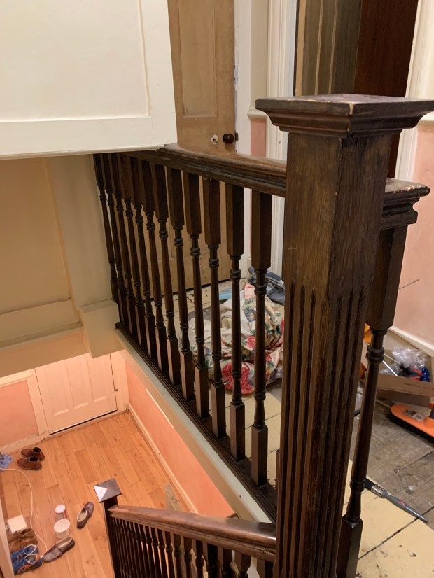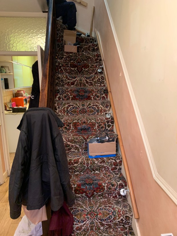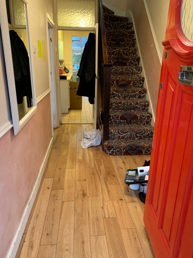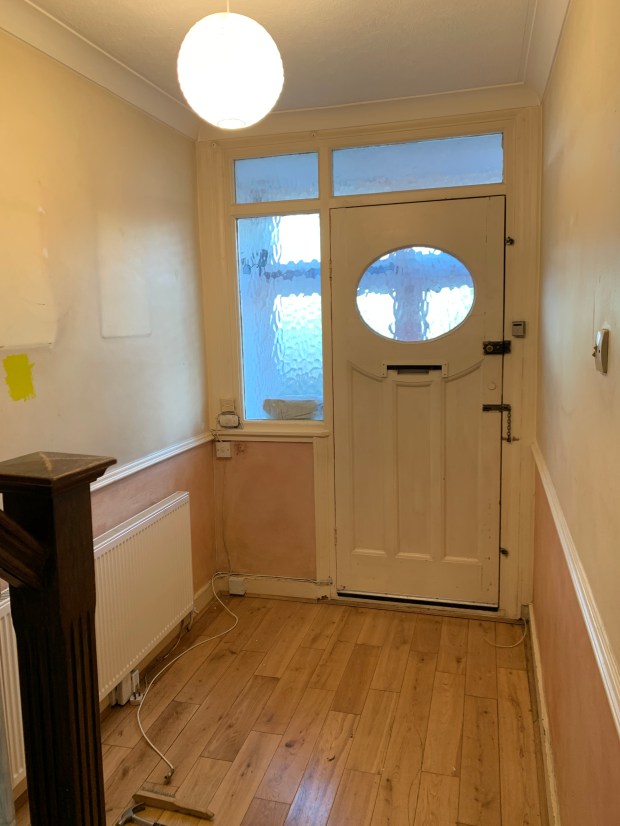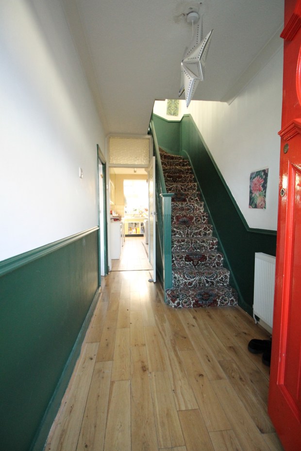 Since our plan is to knock down walls and slightly extend at the back downstairs it didn’t seem worth doing a final redecorate – I have my eye on some expensive wallpaper and don’t want it to get damaged with things going in and out of the house. So instead we cleaned and threw paint at the wall which is a relatively cheap and quick way of making a big difference to an interior.